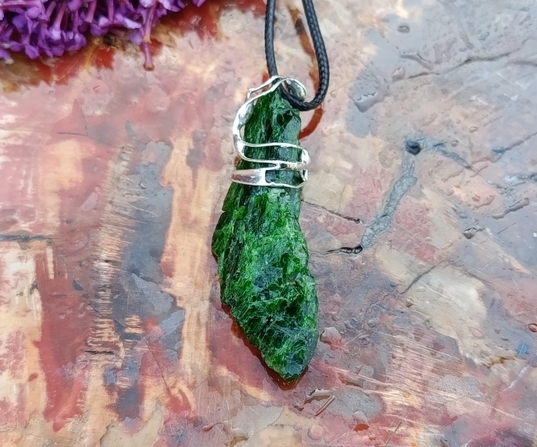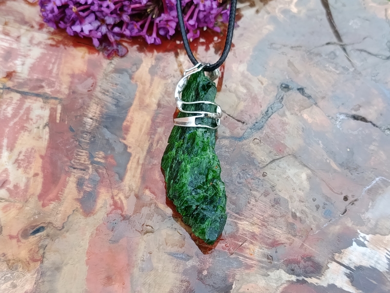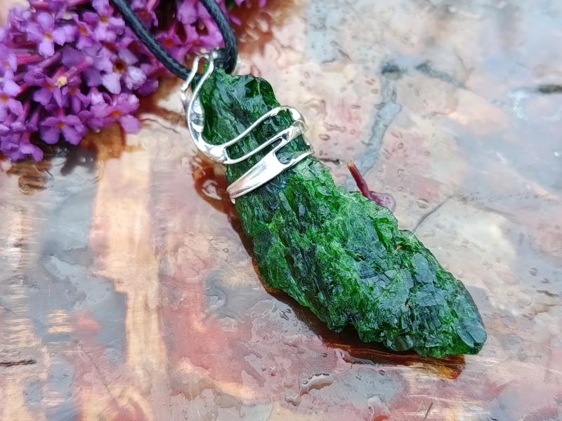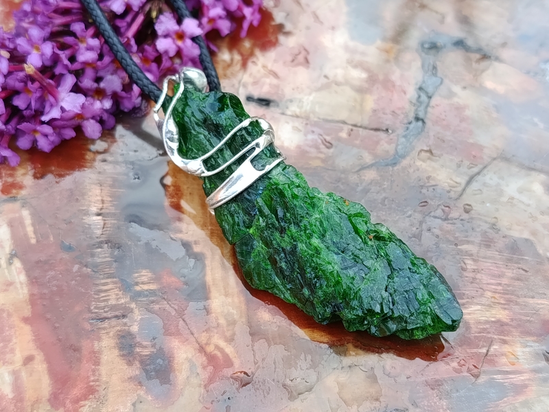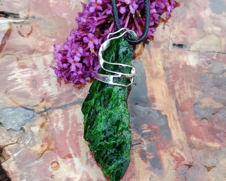 Tento výjimečný šperk s názvem KRÁL z nádherného většího surového chromdiopsidu je zpracován metodou cínování do přívěsku, aby si ho jeho majitel mohl vzít všude, kde bude třeba :-) Nese v sobě velmi zajímavou, prastarou královskou energii a moudrost.
