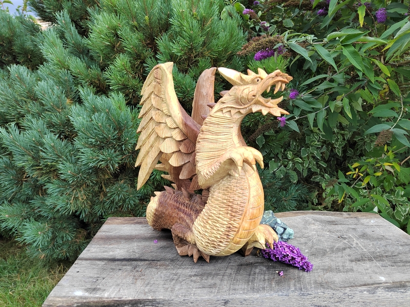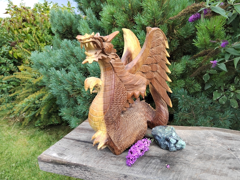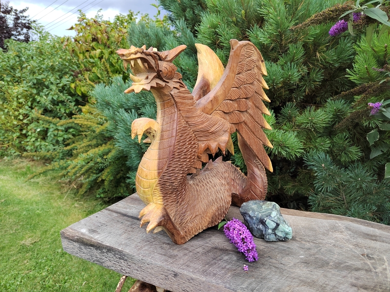 Krásný dřevěný vyřezávaný drak s křídly 31 cm. Téma draků se začíná ozývat čím dál víc. Proto nabízíme tuto moc hezkou dřevořezbu z exotického dřeva.