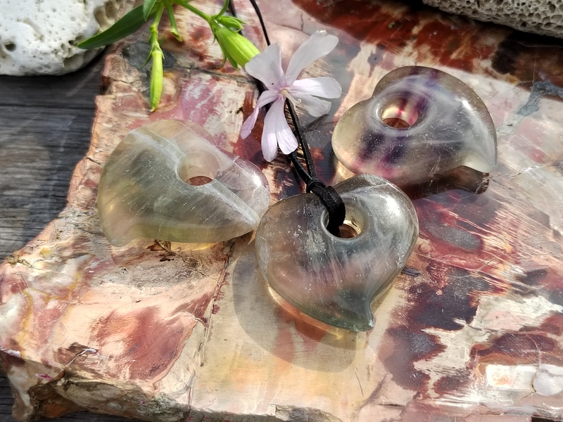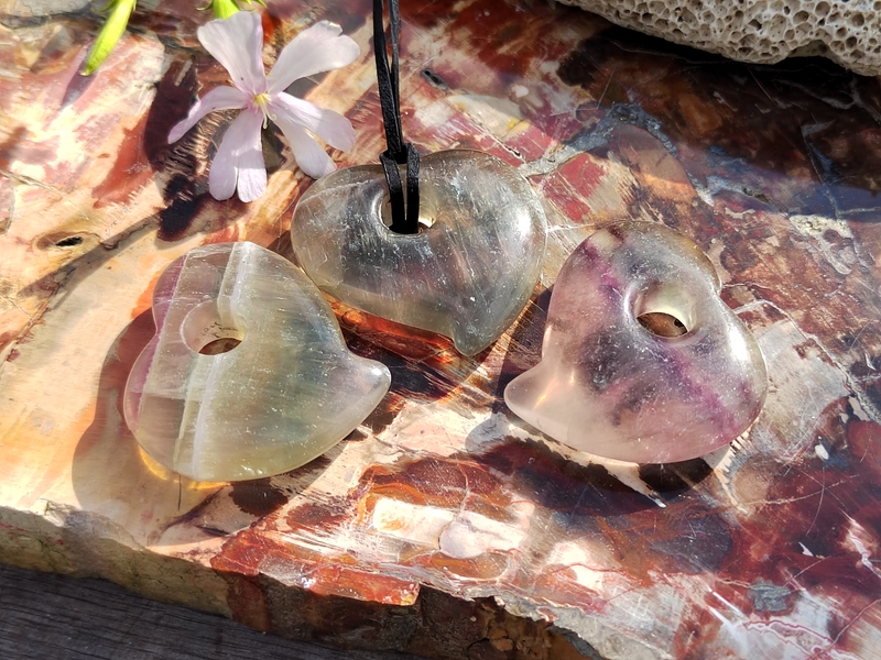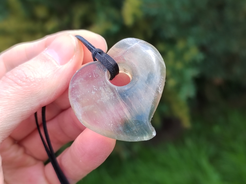 Krásný fluoritový donut ve tvaru srdce přívěsek, který dostanete s koženým řemínkem.  Srdce obdržíte náhodným výběrem viz foto. Fluorit pomáhá sladit naši duševní a fyzickou složku bytí, přináší klid a optimismus, zároveň rozhodnost, sílu, energii.