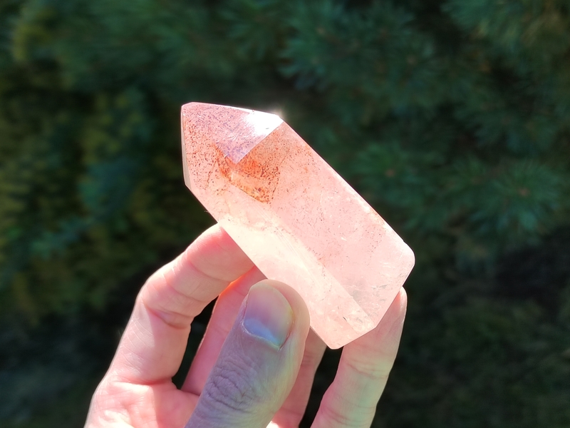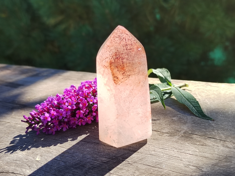 Krásná broušená špice křišťálu s hematitem, která nese mistrovskou formaci Dévický chrám. Je skvělým propojovatelem nejen do energií bytostí andělů, vil, skřítků, dévů atd., ale také pro komunikaci se zdrojovým vědomím. Je tedy příjemným mistrovským společníkem, který vám může ukázat svět z jiné perspektivy. Jde z něj hodně světla a je to úžasný zářič. Skvěle se hodí jako pomocník při energetické práci s klienty.