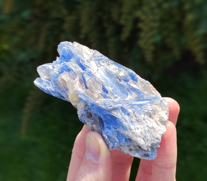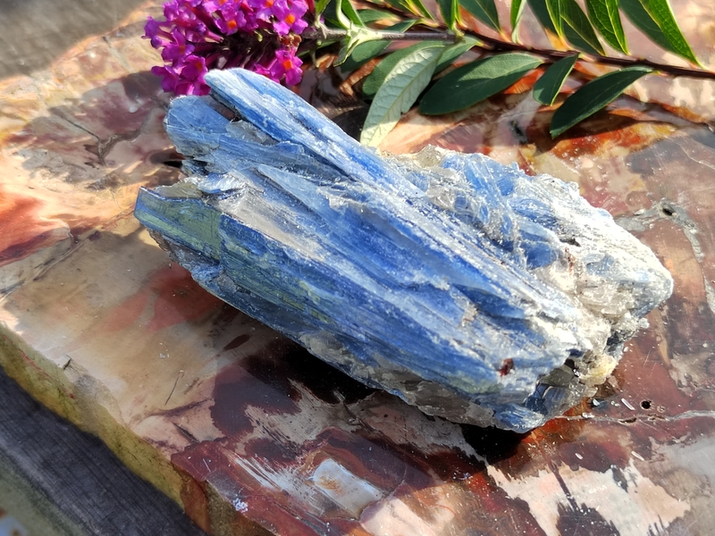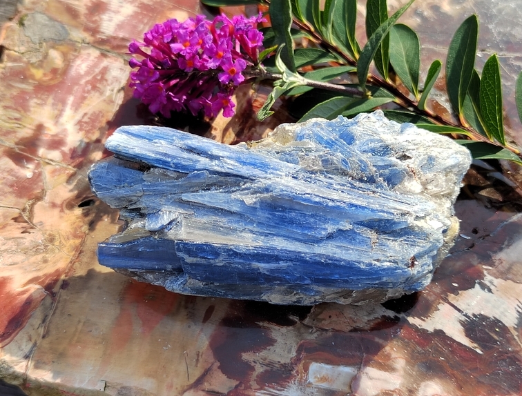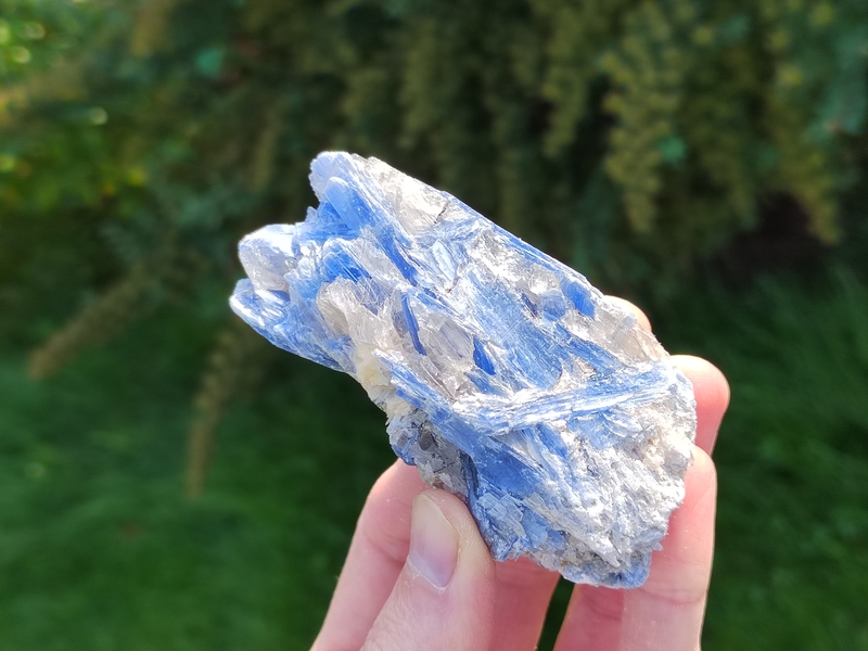 Krásný přírodní modrý kyanit v extra kvalitě v křemeni Vás zaujme na první pohled. Společné propojení kyanitu, křemene a křišťálu lahodí nejen oku, ale krásně se doplňují svými vlastnostmi. Křemen krásně ukotví energii a informace, které s kyanitem získáte. Bude výborným pomocníkem a osobním krystalem pro vědomou spolupráci.