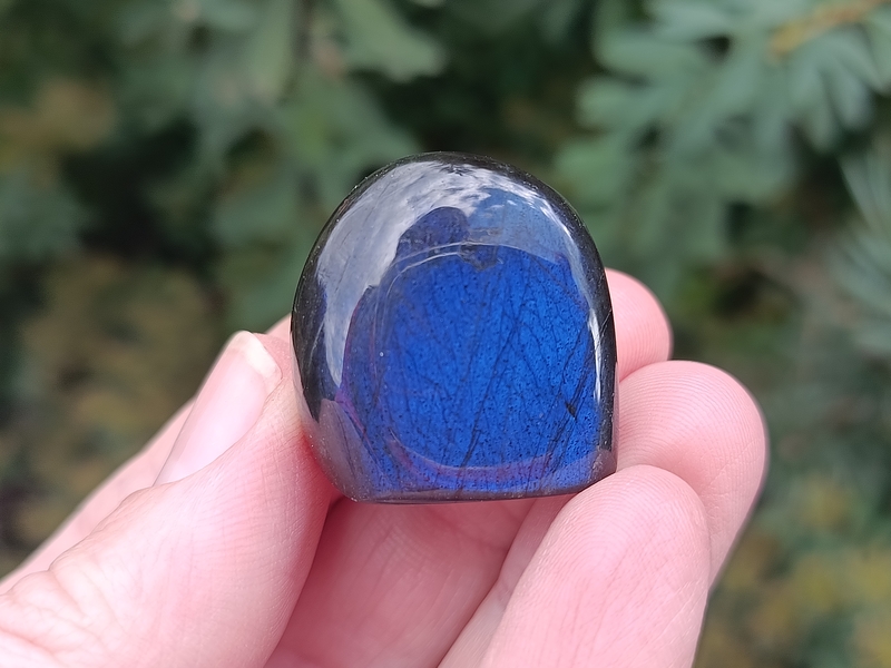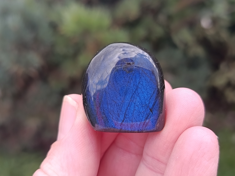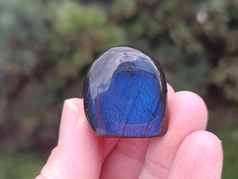 Krásný leštěný stojící mini labradorit s kouzelnými modrými odlesky.
