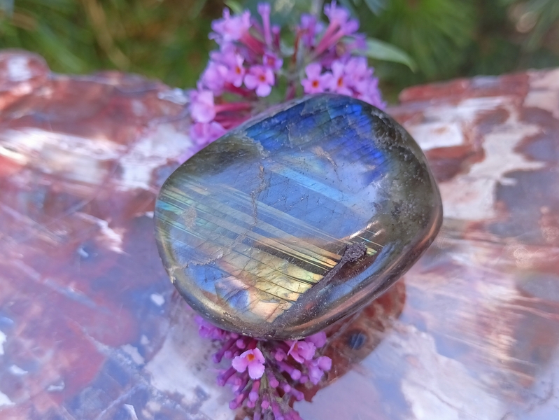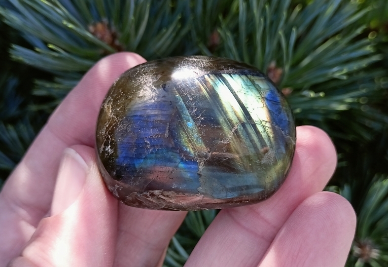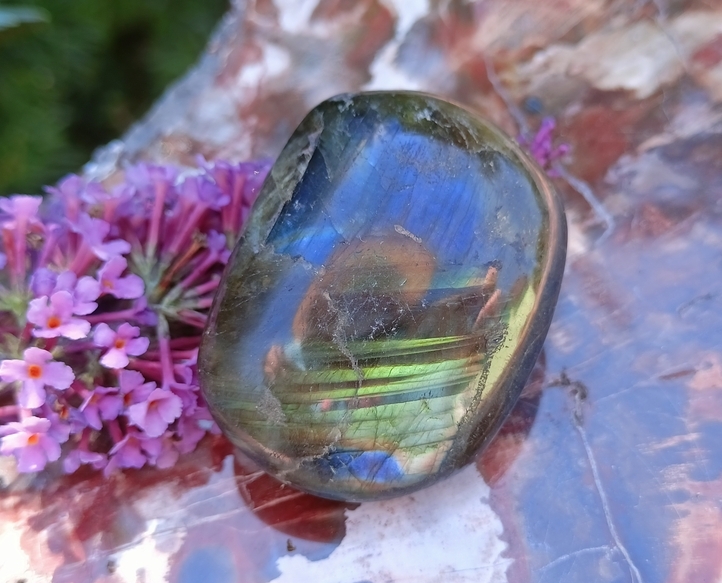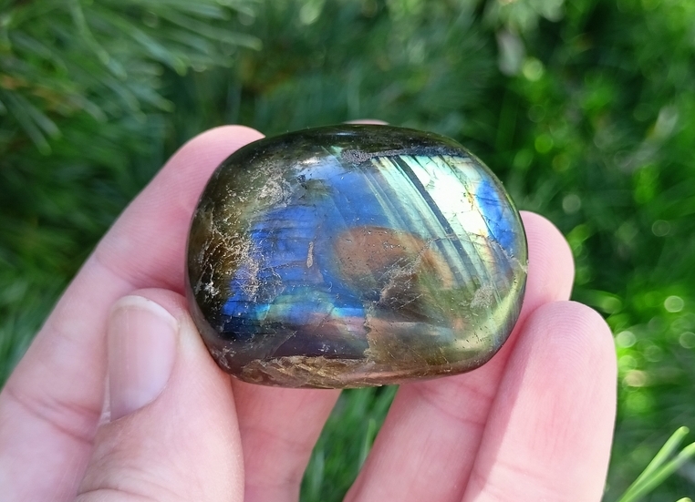 Krásný kousek tromlovaného labradoritu se zajímavými odlesky, který padne hezky do ruku.