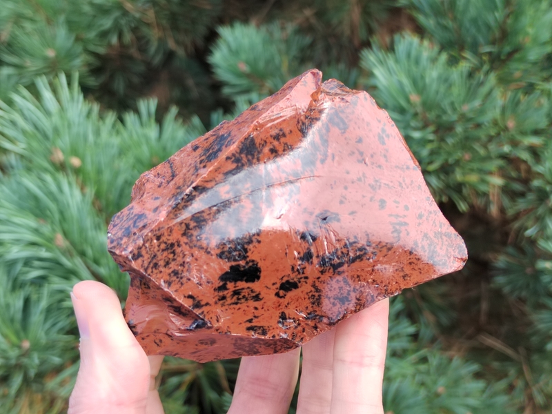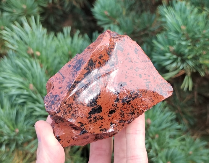 Krásný obsidián mahagonový surový Vás zaujme na první pohled. Povrch je lesklý ze všech stran až na spodní část, ta je matná. Barva je převážně hnědá.