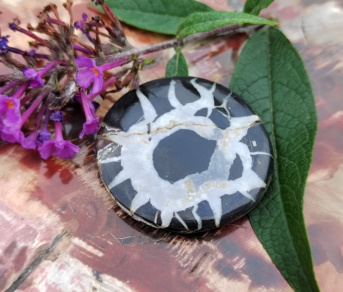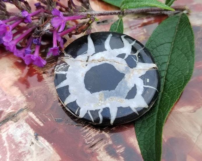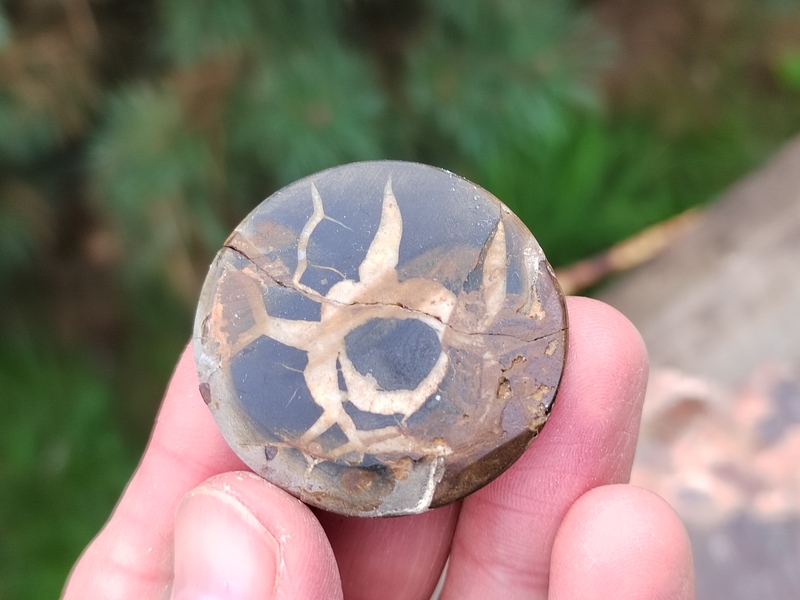 Nádherný velký v půlce LEPENÝ kabošon septárie, který nese tajemnou dračí energii, vhodný na výrobu většího šperku, rozměry: průměr 3,3 cm......14,1 g.